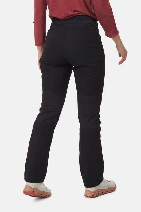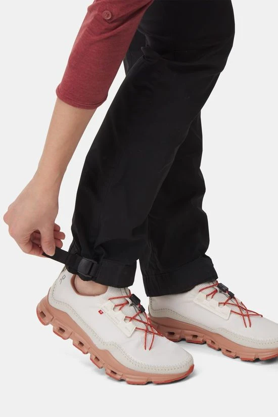 - Het uiteinde van de pijpen heeft verstelbare bandjes en bergschoenhaken om de broek aan je veters te bevestigen.